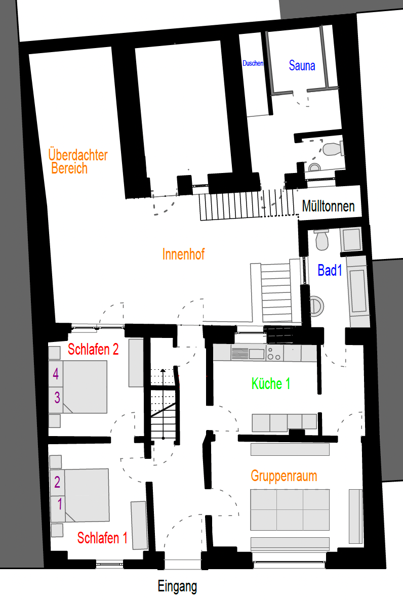 - 2 Schlafzimmer, Küche, Essbereich, Badezimmer, Zugang zum Innenhof, Sauna